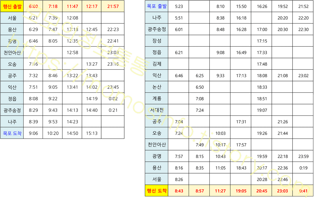 - 정차역: 서울, 용산, 광명, 천안아산, 오송, 공주, 익산, 정읍, 광주송정, 나주