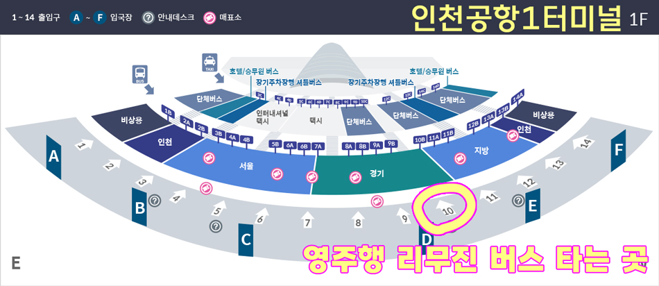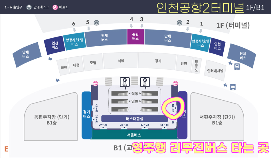 - 인천공항 제1여객터미널(T1): 탑승위치는 1층 10번 승강장입니다.